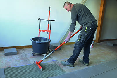 - Une pelle sur perche, plus large qu’une truelle, pour déposer deux fois plus de colle au sol en restant debout.