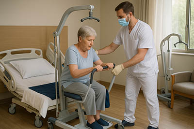 - Lève-personnes (rails ou mobiles) pour transferts impossibles sans portage.